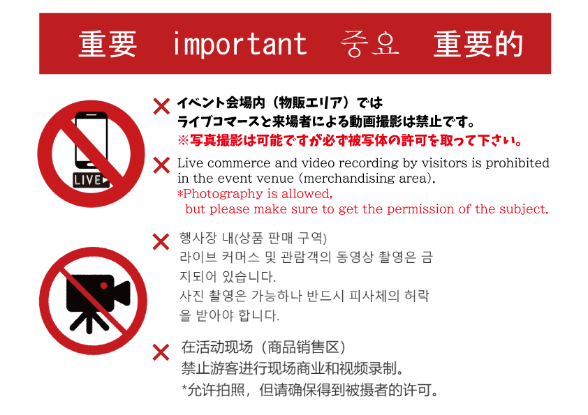 ※出展者様ご自身が自分のスペースで動画を撮られる分には問題ございません。他のお客様が映り込まないようお願い致します。